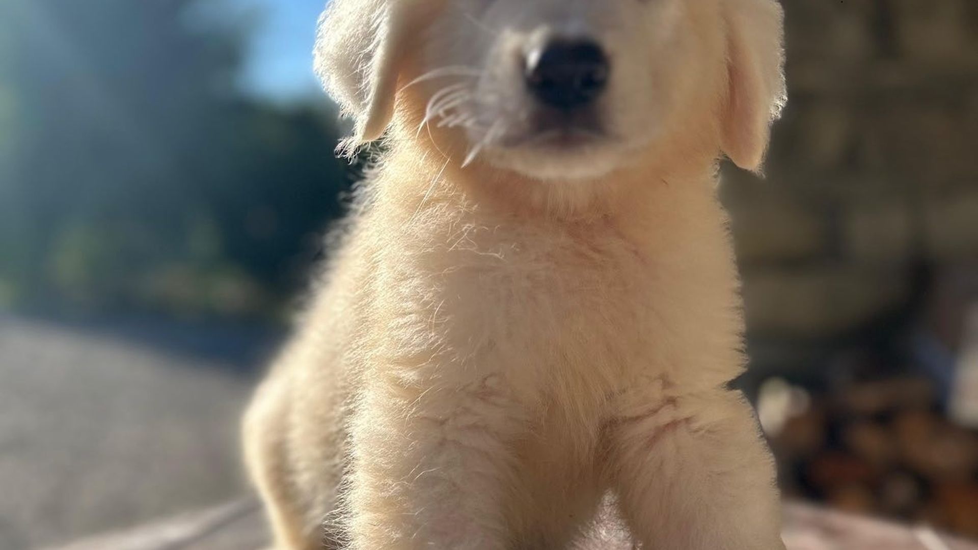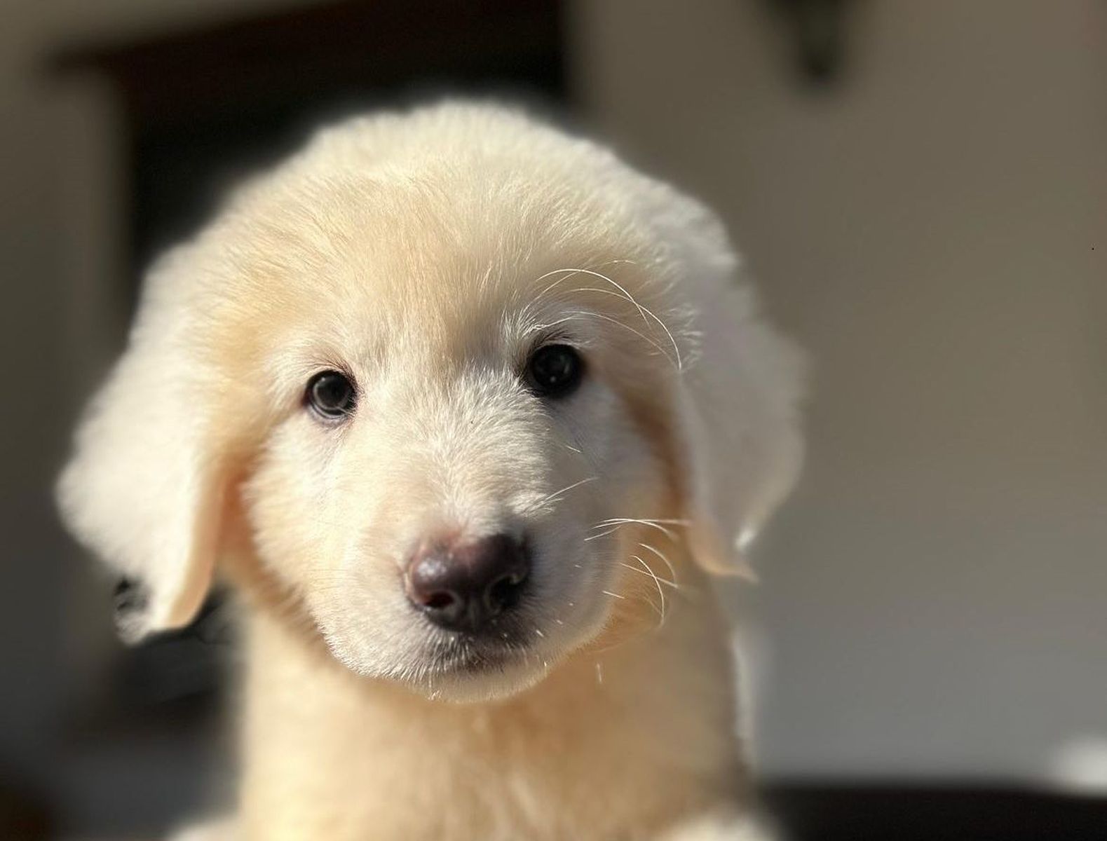 Drei Monate alter Maremmen-Abruzzen-Schäferhundwelpe, ein Exemplar von bemerkenswerter morphologischer und charakterlicher Typizität. Er zeigt eine harmonische und proportionierte Struktur, bereits robust für sein junges Alter, mit solidem Knochenbau und natürlicher Haltung, die die zukünftige Größe und Präsenz der Rasse erahnen lässt.